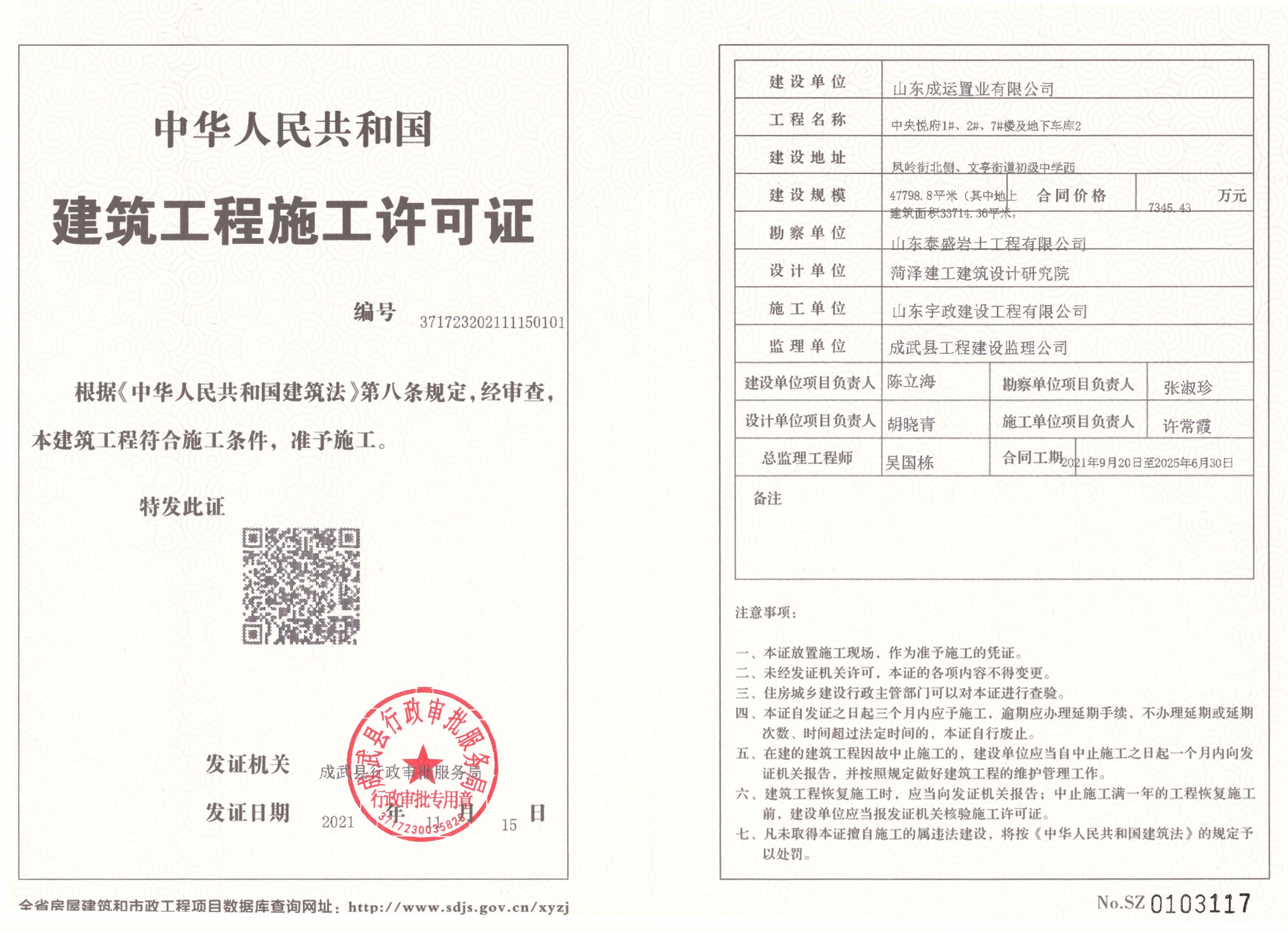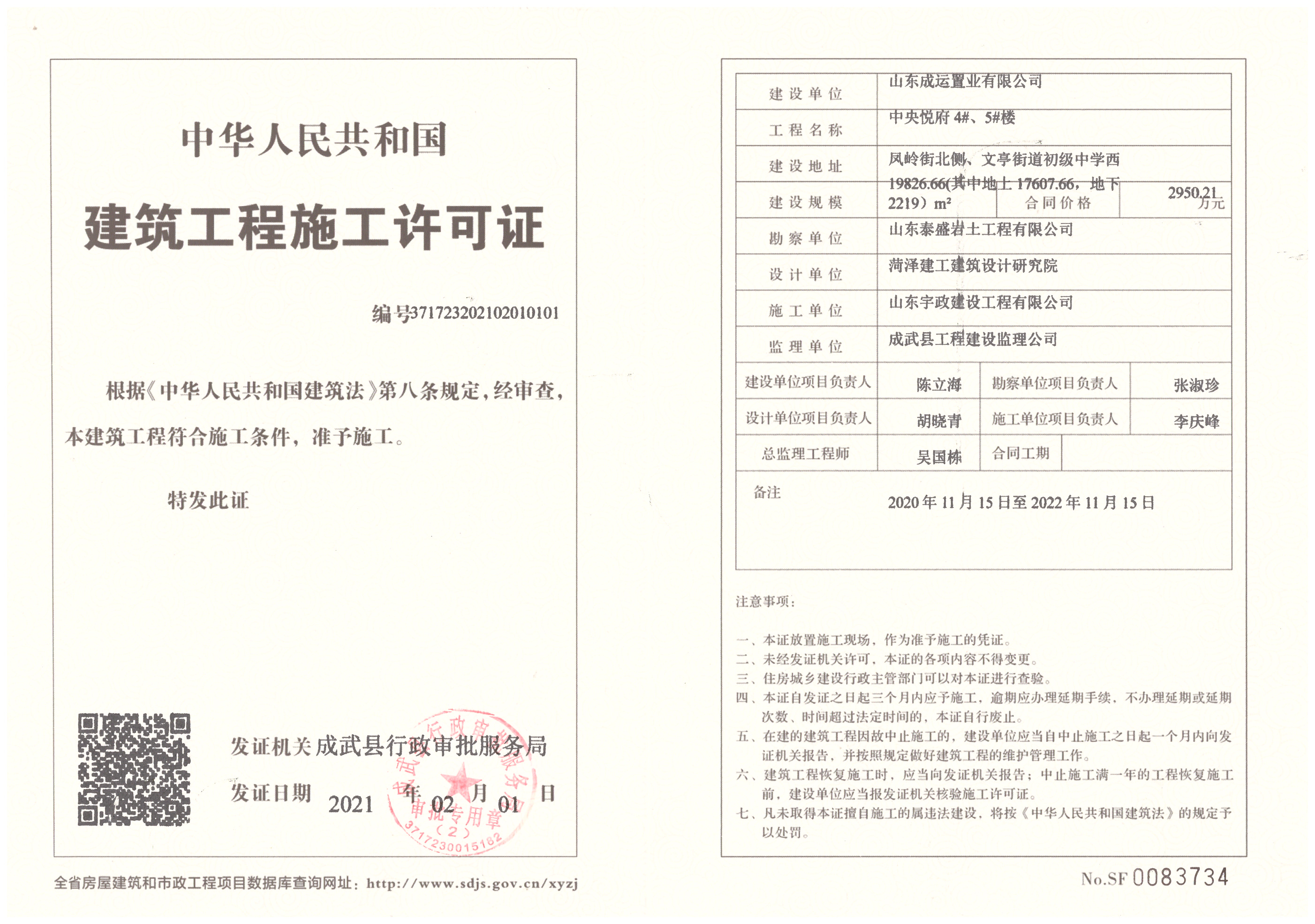 内容概述: | 中央悦府一期建筑工程施工许可 |