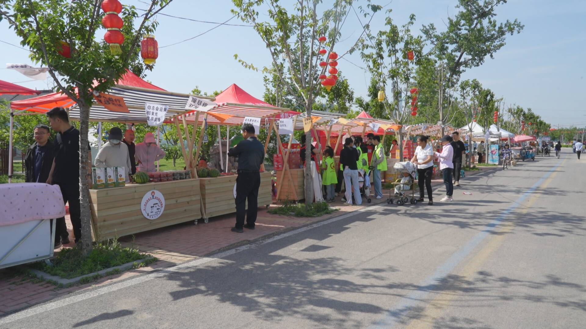 除了非遗体验,村庄里热闹的农产品集市同样吸引了大量游客。村民们纷纷将自家种植的新鲜蔬菜、水果,手工制作的特色食品等摆在摊位上售卖,原汁原味的农家特产,让人目不暇接。游客们穿梭在集市中,挑选着心仪的农产品,感受着浓浓的乡土气息。
