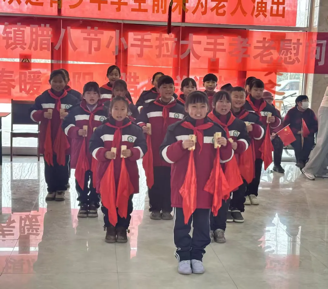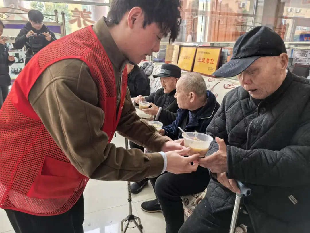 台上精彩纷呈,台下温情涌动。最动人的从来不止是节目本身,而是贯穿始终的亲密互动与真心关怀。表演间隙,少先队员们纷纷主动围到老人身边,甜甜地喊着 “爷爷”“奶奶”,有的小心翼翼搀扶着行动不便的老人慢慢散步,有的坐在老人身旁,耐心地剥着橘子、递着面包,认真倾听老人们讲述过去的岁月故事;大学生青年志愿者们则端着一碗碗精心熬制的腊八粥,粥里盛满了糯米、红枣、桂圆、莲子等食材,热气腾腾、香气扑鼻。他们小心翼翼地送到每位老人手中,轻声叮嘱 “爷爷,粥还热乎,慢点喝”“奶奶,小心烫嘴,慢慢尝”。温热的粥品暖了胃,贴心的话语暖了心,老人们脸上都洋溢着幸福满足的笑容,眼神里满是感动与欣慰。